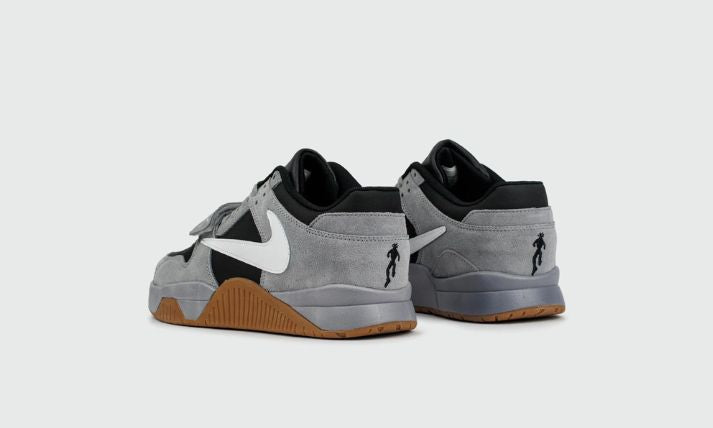 The shoe's standout feature is the signature reverse Swoosh in white leather, a hallmark of Travis Scott collaborations. A midfoot strap adds a functional yet stylish twist, inspired by retro trainers and stamped with subtle Travis Scott branding.